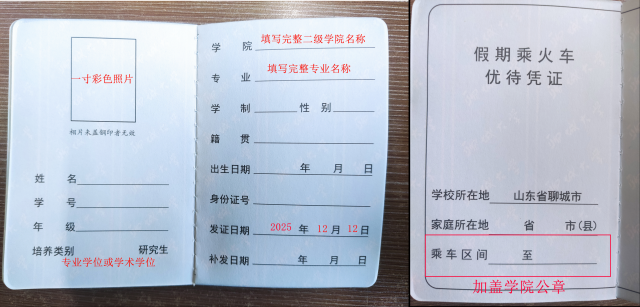 3.领取学生证后,请按“二、学生证填写说明及注意事项”组织学生填写学生证,贴一寸彩色照片,发证日期填写“2025年12月12日”,学生需购买优惠火车票的请填写“乘车区间”内容并盖学院公章。各学院请于2025年12月11日上午9:00-11:30时段内,将填写完个人信息的学生证排序后(按附件2中学生序号顺序)交至办公楼B座B602室。