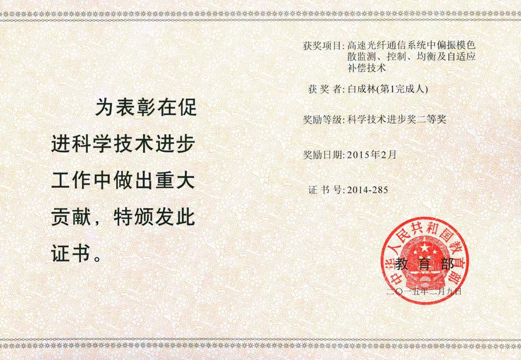 教育部科学技术进步奖二等奖(白成林)