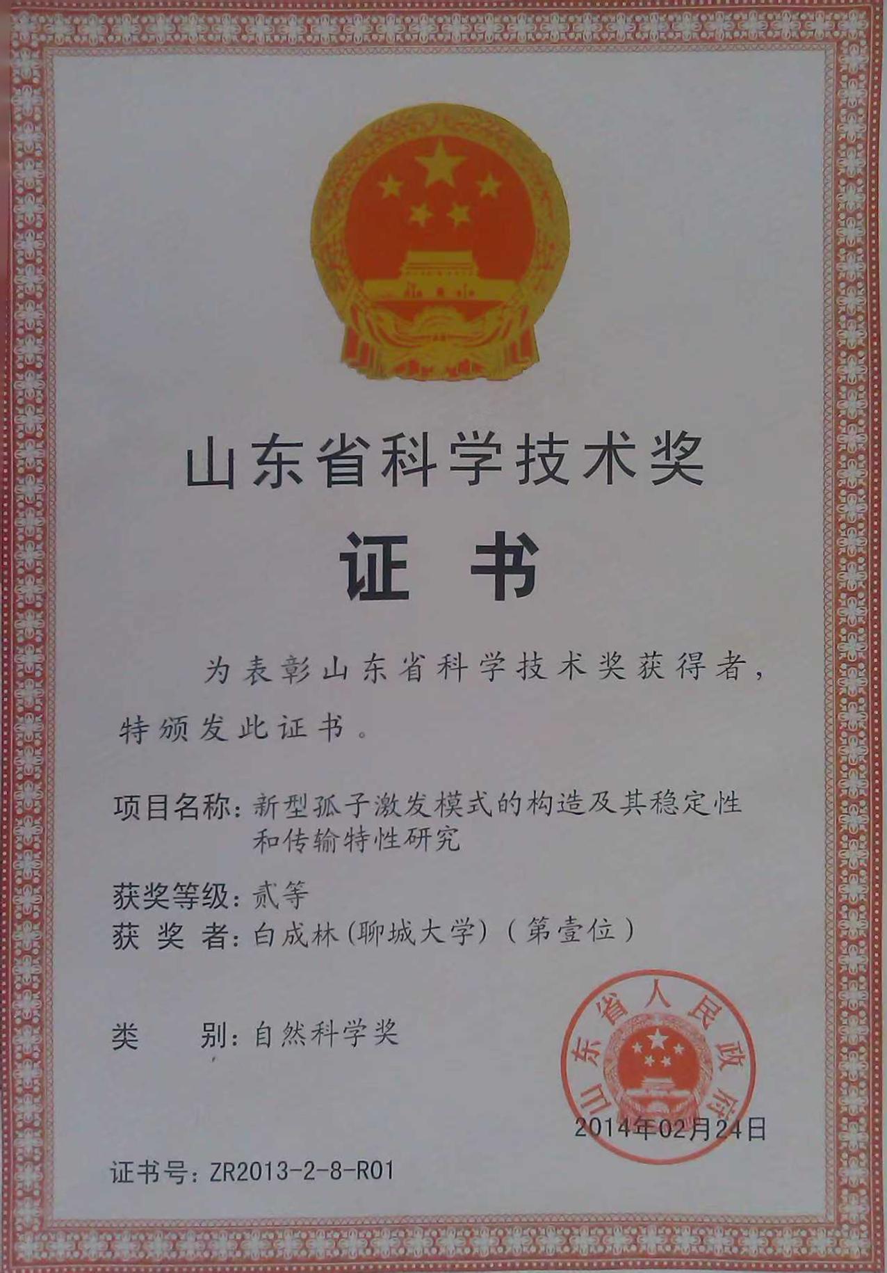 山东省科学技术奖二等奖(白成林)
