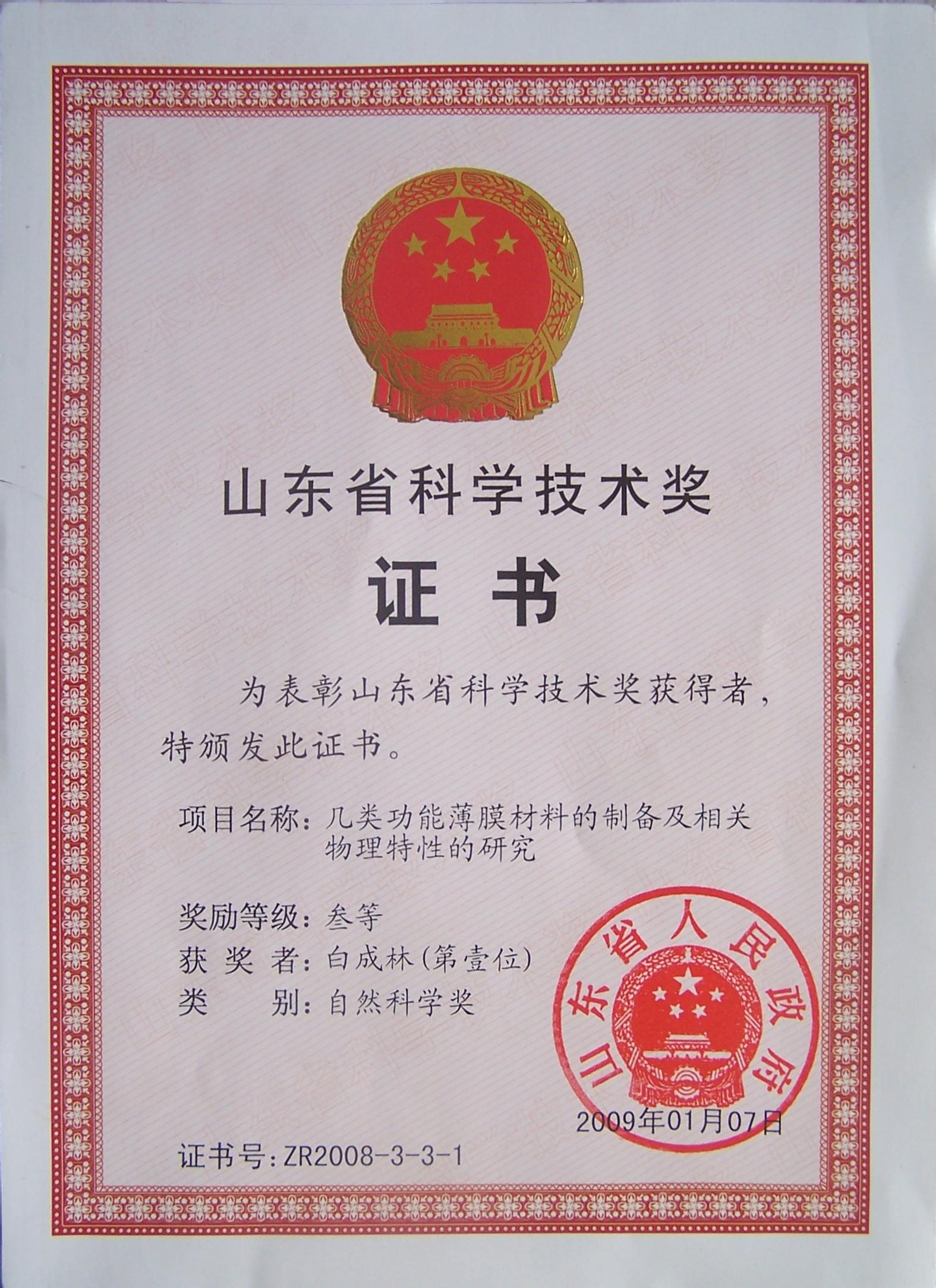山东省科学技术奖三等奖(白成林)