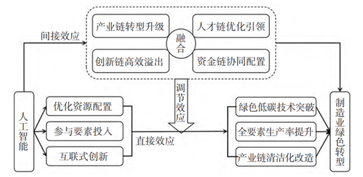 在新一轮科技革命背景下,人工智能成为推动制造业绿色转型的重要驱动力。文章构建包含人工智能和环境因素的理论模型,实证检验人工智能对制造业绿色转型的驱动效应与作用路径。研究发现:人工智能对制造业绿色转型具有催化剂效应,通过促进产业链转型升级、创新链高效溢出、人才链优化引领、资金链协同配置来推动制造业绿色转型;人工智能显著促进“四链”融合,且随着融合水平的提升,人工智能对制造业绿色转型的促进效应呈现边际递增态势。